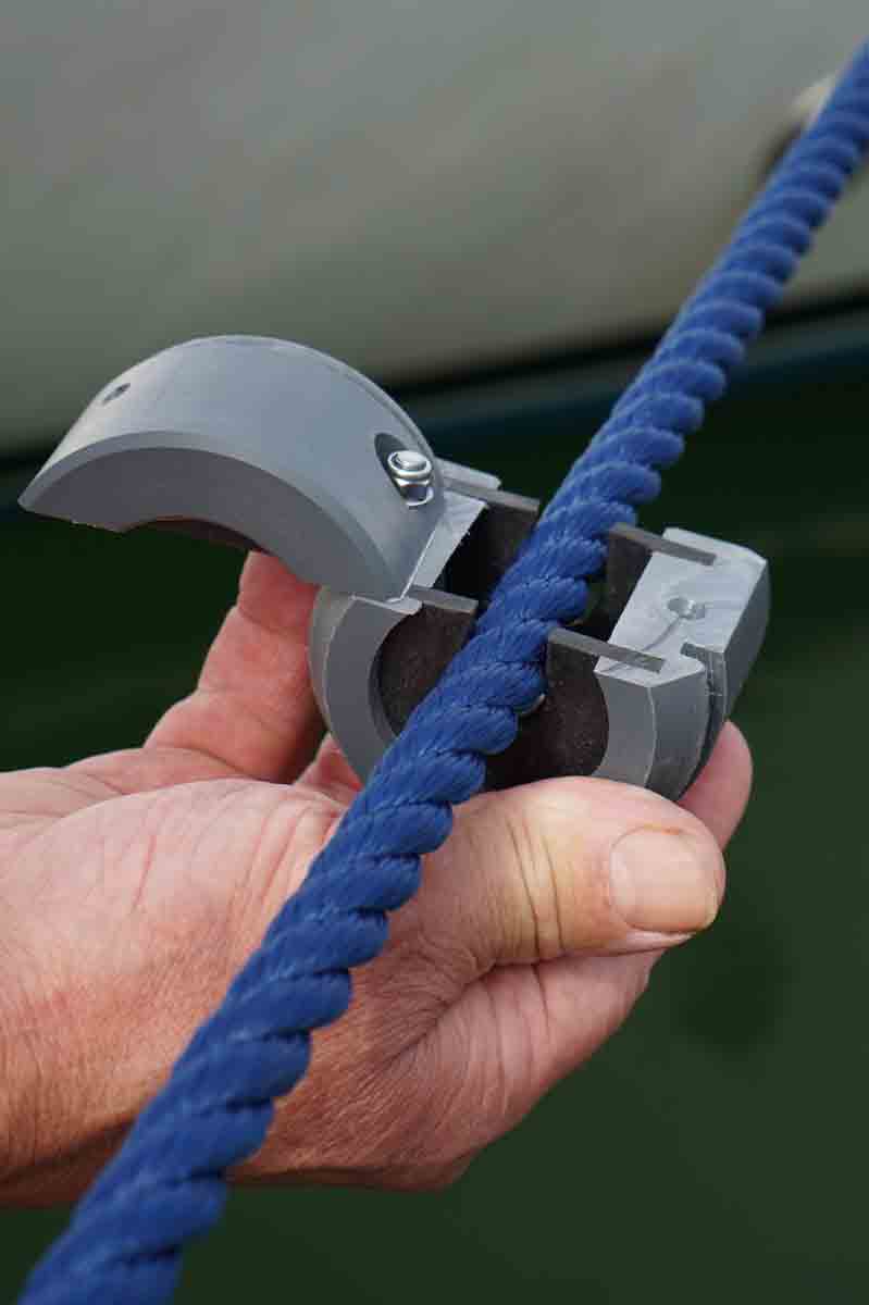 Installation: Open the grey split hub and close it around the line or chain. The inside of the central section features dual rubber baffles that close tightly around the line or chain keeping the guard in place. Depending on the model, 1 or 2 pairs of different rubber inserts are supplied for the right size of rope or chain. Then just clip on the black disc and the Rat Guard is ready for use.
